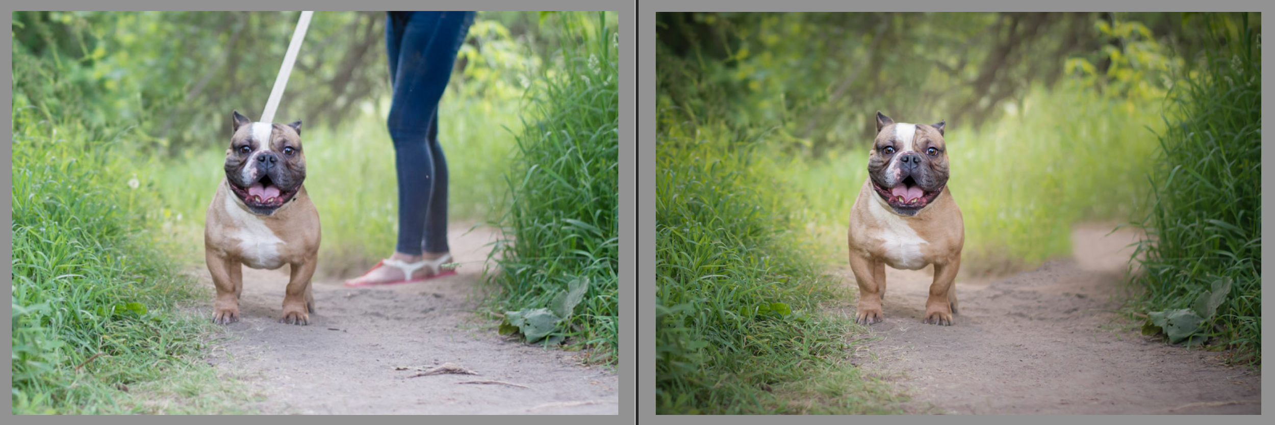 This is probably the most commonly asked question. You must be looking at my portfolio of all the scenic outdoor locations with dogs off leash. You’d probably never guess that actually 90% or more of The Doggy Did It Photography sessions are actually done on leash. Safety first, right? Your final images will be professionally edited to remove the leash… and sometimes even the people attached to them. You can see an example in the image below. So worry not, you can still get those gorgeous scenic outdoor portraits with your dog on leash.